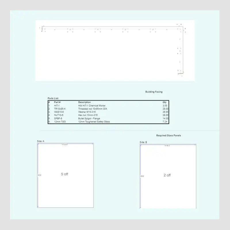 The online app allows installers to generate a full bill of materials and detailed installation plans for level installations by doing a simple line drawing and entering balcony lengths. For glass balustrades, the app calculates all pane sizes.